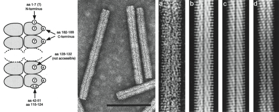 Figure 1 (Left) Scheme showing the accessibility to antibodies of various parts of the coat protein amino acid (aa) sequence in particles of beet necrotic yellow vein virus (BNYVV). Encircled numbers designate different epitopes. (Center) Negative contrast electron micrograph of stained purified particles of BNYVV. (Right) From left (a) negative contrast electron micrograph of a BNYVV particle and (b, c, d) computer-filtered micrographs of BNYVV particles (courtesy of A.C. Steven, from Virology113, 428 (1981); with permission). The bar represents 100 nm.