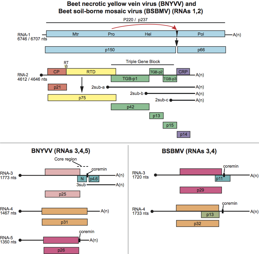 In naturally infected plants, viruses contain four to five linear positive sense ssRNAs of about 6.7, 4.6, 1.8, 1.4 and 1.3 kb, respectively. The viral RNAs are capped at the 5′ end and, unlike the RNAs of all other rod-shaped plant viruses, are 3′-polyadenylated. Viral RNAs harbour a conserved 3′ structure essential for RNA replication initiation. After mechanical transmission to laboratory test plants, beet necrotic yellow vein virus (BNYVV) RNAs 3, 4 and 5 may carry deletions or may be lost entirely. The complete sequence has been determined for all five RNAs of different isolates of BNYVV and for the four RNAs of an isolate of beet soil-borne mosaic virus (BSBMV). The possible additional members rice stripe necrosis virus (RSNV) and burdock mottle virus (BdMV) apparently only contain two genomic RNAs.