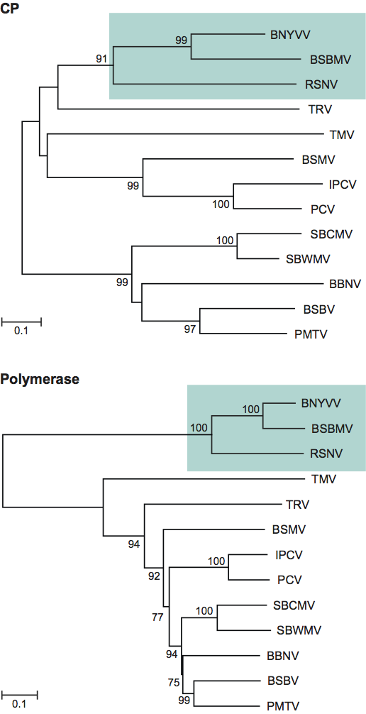 Figure 3 Phylogenetic (distance) tree based on the codon-aligned nucleotide sequences of the capsid (CP) and polymerase proteins of rod-shaped plant viruses. Numbers on branches indicate percentage of bootstrap support out of 10,000 bootstrap replications (when >60%). The scales indicate maximum composite likelihood distances. Trees produced in MEGA4. Viruses (or possible members) of the genus Benyvirus are highlighted. Other viruses are Genus Pomovirus: potato mop top virus (PMTV), beet soil-borne virus (BSBV), broad bean necrosis virus (BBNV); Furovirus: soil-borne cereal mosaic virus (SBCMV), soil-borne wheat mosaic virus (SBWMV); Tobamovirus: tobacco mosaic virus (TMV); Tobravirus: tobacco rattle virus (TRV); Hordeivirus: barley stripe mosaic virus (BSMV); Pecluvirus: Indian peanut clump virus (IPCV), peanut clump virus (PCV).