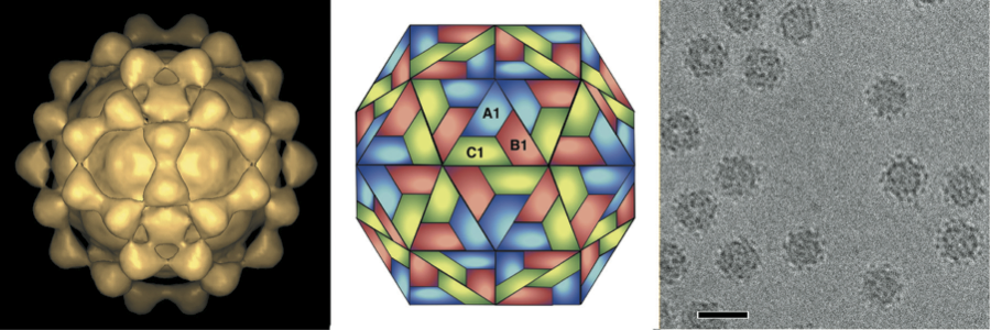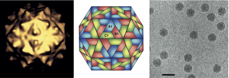 Figure 1 (Left) Image reconstruction of a particle of Flock House virus (FHV). (Center) Schematic representation of a T=3 icosahedral lattice. (Right) Cryo-electron micrograph of particles of FHV; the bar represents 50 nm.
