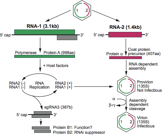 The genome consists of two molecules of positive sense ssRNA: RNA1 (Mr 1.1×106, 3.1 kb) and RNA2 (Mr 0.48×106, 1.4 kb). Both molecules are required for infectivity, and both are encapsidated in the same virus particle. Both RNA molecules are capped at their 5′ ends with cap zero structures and lack poly(A) tails at their 3′ ends. RNA 3′ ends cannot be chemically derivatized even after treatment with denaturing solvents, indicating that the expected 3′-terminal-OH groups are unreactive.