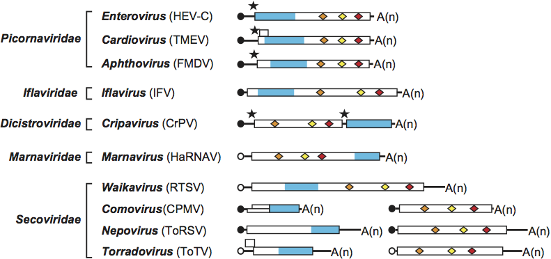 Figure 1 Genome organization of representative members of the order Picornavirales. Each RNA is shown with the ORF(s) represented with the boxes. Circles depict VPg molecules covalently attached at the 5′ end of the RNAs. Black circles represent VPg confirmed experimentally and open circles represent putative VPgs. Poly(A) tails are represented at the 3′ end of the RNAs [A(n)]. Conserved motifs for the helicase (orange diamonds), 3C or 3C-like proteinase (yellow diamonds), RNA-dependent RNA polymerase (red diamonds) and the domains for coat protein(s) (blue rectangles) are shown. Please refer to chapters describing each family for further details (presence and function of additional protein domains, position of cleavage sites, etc.). When characterized, internal ribosome entry sites are shown with the black stars (families Picornaviridae and Dicistroviridae). This has not been studied for other members of the order. Abbreviation for virus species are as follows: human enterovirus C (HEV-C), Theiler’s murine encephyalomyocarditis virus (TMEV), foot-and-mouth disease virus (FMDV), infectious flacherie virus (IFV), cricket paralysis virus (CrPV), Heterosigma akashiwo RNA virus (HaRNAV), rice tungro spherical virus (RTSV), cowpea mosaic virus (CPMV), tomato ringspot virus (ToRSV), tomato torrado virus (ToTV).