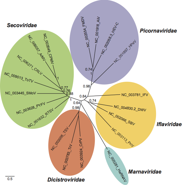 In an unrooted maximum-likelihood tree built for representatives of the order using the amino acid sequence contained in the proteinase-polymerase region, all families except the Iflaviridae form monophyletic branches (Figure 2).
