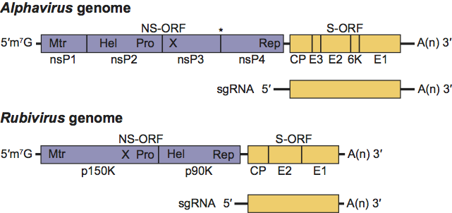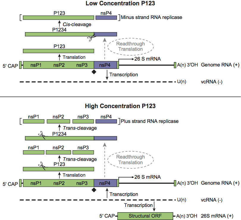 While RUBV and the alphaviruses share homology in the cis-acting elements at the 5′ end of the genome and in the subgenomic promoter region, there are major differences in their replication processes. In alphaviruses, the initial polyproteins generated, P123 and/or P1234, are cleaved in trans by the viral protease activity of the nsP2 protein. The P123 precursor protein combined with nsP4 form the replication complex associated with minus-strand replication. This negative-strand serves as the template in the synthesis of a full-length, positive sense RNA that will eventually be encapsidated as well as a subgenomic 26S mRNA that encodes the viral structural proteins. Cleavage of the P123 polyprotein generates nsP1, nsP2 and nsP3 individual proteins which are involved in positive-strand synthesis. In RUBV, the polyprotein precursor is cleaved either in cis or trans into two products, P150 and P90, by a protease located near the C-terminus of P150. The order of functional motifs in the RUBV genome is different from that of the alphaviruses with P90 polyprotein containing both helicase and replicase motifs.
