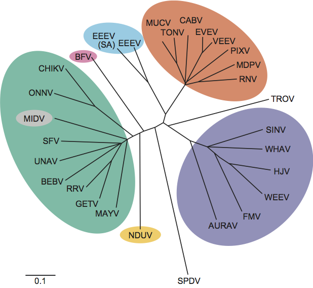 Figure 4 Unrooted phylogenetic tree of representative isolates of all alphavirus species generated from the E1 nucleotide sequences using the F84 algorithm of the neighbor-joining program (SESV and RUBV are not included because no homologous sequence for this region is available). Virus abbreviations are from the list of species in the genus Alphavirus. Antigenic complexes are indicated by colored circles.