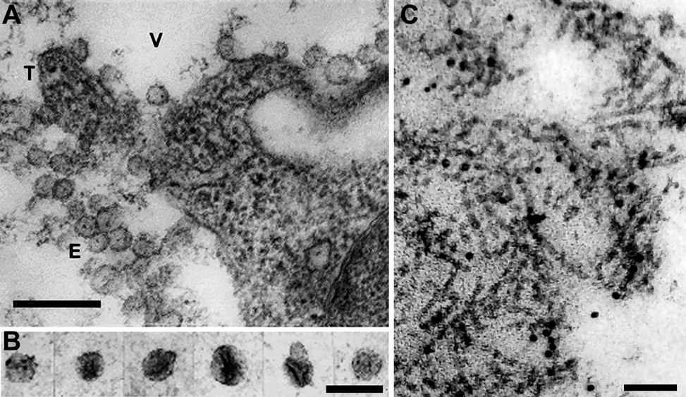 Figure 1 (A) Section of palisade mesophyll cell from a leaf of Nicotiana clevelandii systemically infected with carrot mottle virus (CMoV), showing enveloped structures (E) about 52 nm in diameter in the cell vacuole (V) in association with the tonoplast (T). The bar represents 250 nm. (B) Enveloped structures about 52 nm in diameter in a partially purified preparation from CMoV-infected N. clevelandii, stained with 2% uranyl acetate. The bar represents 100 nm. (C) Section of a Nicotiana benthamiana cell expressing the GRV ORF3 protein. The section shows filamentous ribonucleoprotein particles embedded in an electron-dense matrix. The section was labeled by in situ hybridization with a GRV-specific RNA probe. The bar represents 100 nm.