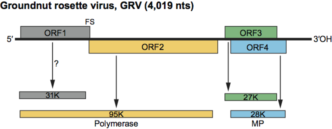Figure 2 Diagram showing the genomic organization of groundnut rosette virus (GRV). The continuous horizontal line represents the genome RNA, and the numbered blocks the correspondingly numbered ORFs. The lower part of the diagram shows the predicted translation products, with their size. The potential product of ORF1 has not been shown to exist. The single product produced from ORFs 1 and 2, probably as a result of a 1 frameshift event (FS), is thought to be a polymerase because it contains, in the ORF2 region, sequences characteristic of viral RdRp. The ORF3 product functions to protect viral RNA and enable its transport through the phloem. The ORF4 product, marked MP, has a cell-to-cell movement function.