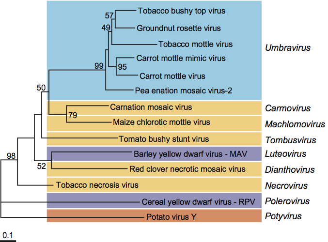 Figure 3 Phylogenetic relationships of the RdRps of umbraviruses and some other plant viruses. Amino acid sequences were aligned using the ClustalX2 program. The neighbour-joining trees were produced and bootstrapped using the PHYLIP package programs. Numbers at the nodes represent bootstrap values as percentages obtained from 2000 replications, shown only for branches supported by more than 40%. Length of branches is proportional to number of changes.