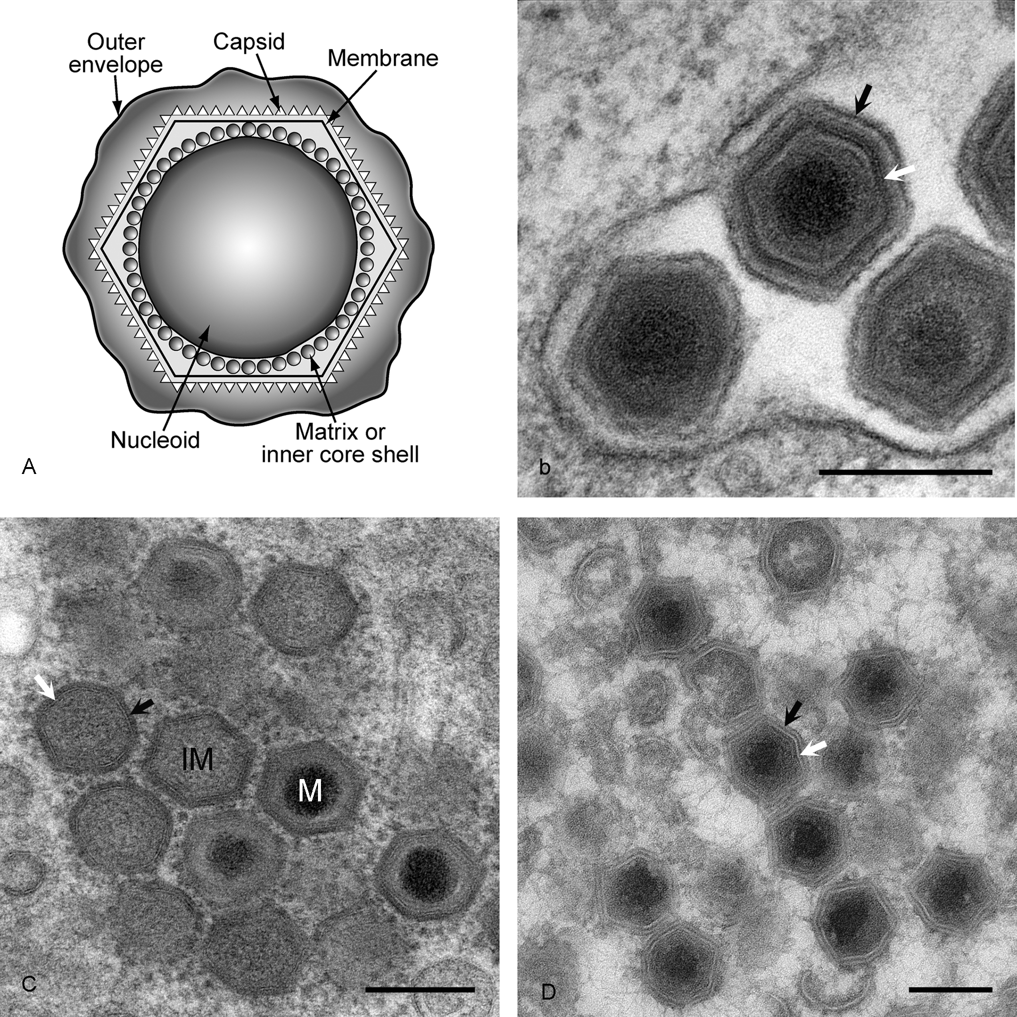 Figure 1 (a) Diagram of extracellular ASFV virions showing nucleoid, matrix or inner core shell, capsid and lipid envelopes. (b) EM image of extracellular virions. Black arrow is outer envelope, white arrow is virus membrane. Bar=200 nm. The preparation method was standard chemical fixation for EM. (c) EM image of intracellular virions. IM=immature virion, M=mature virion. Black arrow is capsid protein, white arrow is virus membrane. Bar=200 nm. Preparation method was high pressure freezing followed by freeze substitution. (d) EM image of intracellular virions. Black arrow is capsid protein, white arrow is virus membrane. Bar=200 nm. Preparation method was thawed cryo-sections stained with uranyl acetate.