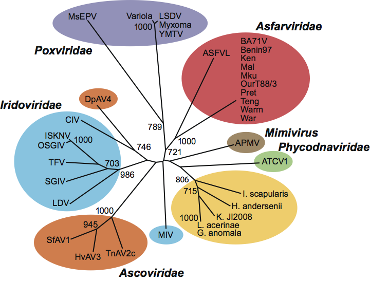 Figure 2 Phylogenetic analysis of ASFV sequences for RNA polymerase, compared to corresponding sequences from dsDNA viruses and non-viral sequences. Sequences are shown in color as follows: asfarviruses, red; mimivirus, brown; poxviruses, purple; phycodnaviruses, green; ascoviruses, orange; iridoviruses, blue; non-viral Blast matches, yellow. Bootstrap values over 65% (>650) are shown. Abbreviations: APMV, Acanthamoeba polyphaga mimivirus; ATCV1, Acanthocystis turfacea chlorella virus 1; CIV, Chilo iridescent virus; DpAV4, Diadromus pulchellus ascovirus 4; G. anomala, Glugea anomala; H. andersenii, Hemiselmis andersinii; HvAV3, Heliothis virescens ascovirus 3; I. scapularis, Ixodes scapularis; ISKNV, infectious spleen and kidney necrosis virus; K. JI2008, Kabatana sp. strain JI2008; L. acerinae, Loma acerinae; LDV, lymphocystis disease virus; LSDV, lumpy skin disease virus; MsEPV, Melanoplus sanguinipesentomopoxvirus; OSGIV, orange-spotted grouper iridovirus; SfAV1, Spodoptera frugiperda ascovirus 1; SGIV, Singapore grouper iridovirus; TFV, tiger frog virus; TnAV2c, Trichoplusia ni ascovirus 2c; YMTV, Yaba monkey tumor virus, Variola, ASFVL African swine fever virus-like sequence.