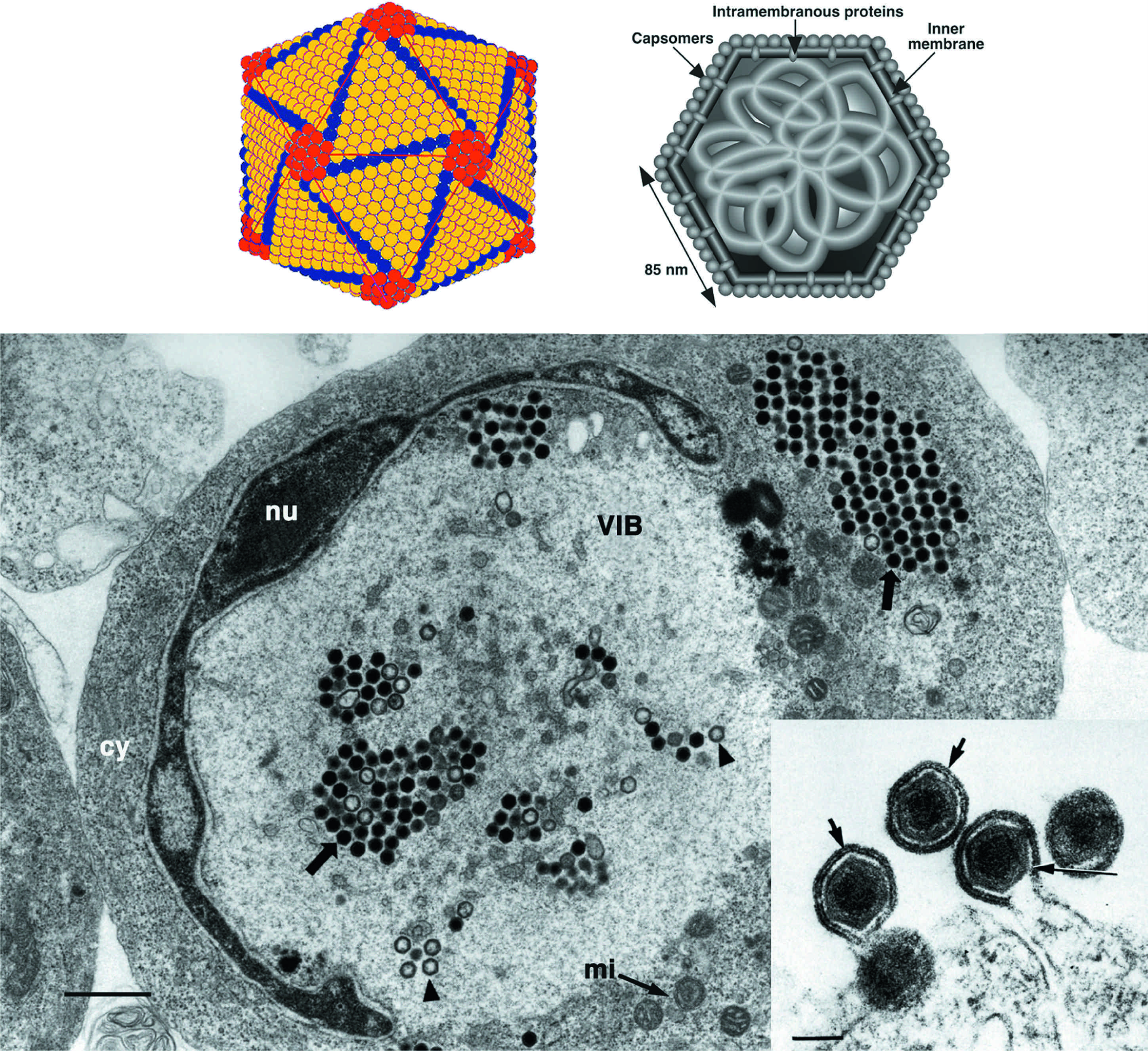 Figure 1 (Top left) Outer shell of invertebrate iridescent virus 2 (IIV-2) (from Wrigley et al. (1969). J. Gen. Virol.5, 123; with permission). (Top right) Schematic diagram of a cross-section of an iridovirus particle, showing capsomers, transmembrane proteins within the lipid bilayer, and an internal filamentous nucleoprotein core (from Darcy-Tripier et al. (1984). Virology138, 287; with permission). (Bottom left) Transmission electron micrograph of a fat head minnow cell infected with an isolate of European catfish virus. Nucleus (nu); virus inclusion body (VIB); paracrystalline array of non-enveloped virus particles (arrows); incomplete nucleocapsids (arrowheads); cytoplasm (cy); mitochondrion (mi); the bar represents 1 m (from Hyatt et al. (2000). Arch. Virol.145, 301; with permission). (insert) Transmission electron micrograph of particles of frog virus 3 (FV-3), budding from the plasma membrane. Arrows and arrowheads identify the viral envelope; the bar represents 200 nm