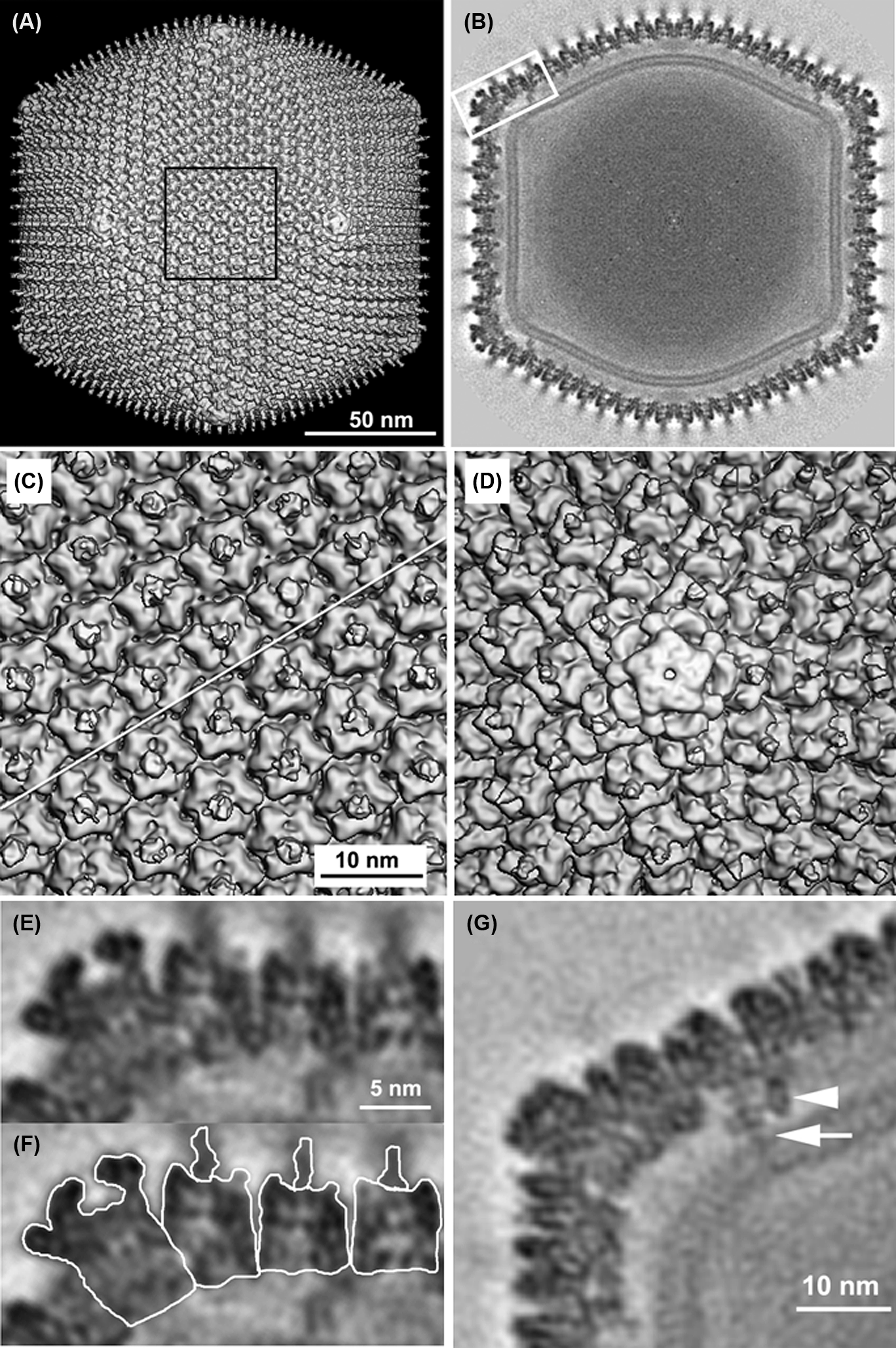 The outer surface of the capsid is covered by flexible fibrils or fibres. Conventional EM studies have suggested that these fibrils are often rather short (ca. 2.5 nm in length) and may have terminal knobs, but in IIV-6 a single fibril of 2 nm width and about 35 nm in length extends outwards from the centre of each trimeric capsomer (Figure 2F; Figure 3). The role of the fibrils remains unknown.
