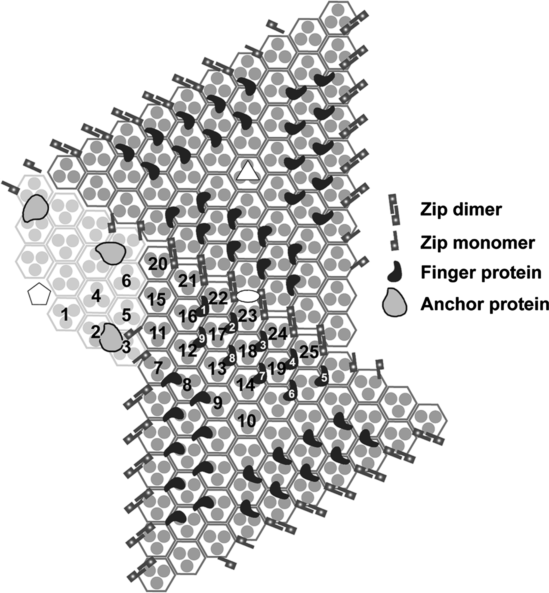 Figure 3 Schematic planar diagram of the IIV-6 capsid structure with the central pentamer complex (white pentagon) omitted for clarity. The centrally located white ellipse, triangle and pentagon symbols highlight the positions of 2-, 3-, and 5-fold icosahedral axes, respectively. All major capsid protein trimers are shown as three small grey disks enclosed by a hexagon. The icosahedral asymmetric unit contains 24 and one-third of these capsomers (numbered 125). Each trisymmetron contains 55 capsomers, all oriented similarly and rotated by 60 relative to those in the adjacent trisymmetron. Finger proteins bind to each trisymmetron (nine within one asymmetric unit are numbered in white), a total of 27 in each trisymmetron. A total of 18 Zip dimers are present at the interface between one trisymmetron and its adjacent trisymmetrons. Zip monomers are located at the interface between a trisymmetron and its neighbouring pentasymmetrons. The transmembrane anchor proteins (shown in Figure 2G) are located under capsomers 2 and 3 beneath the pentasymmetron.