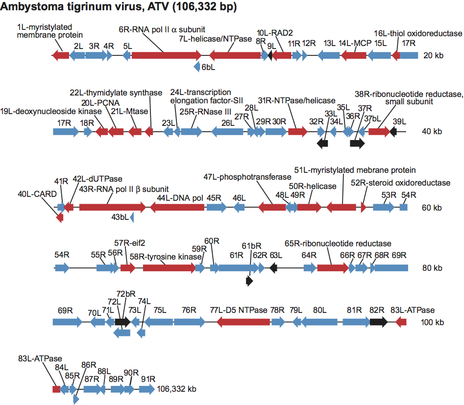 Figure 4 Genomic structure of Ambystoma tigrinum virus (ATV). Arrows represent viral ORFs with their size, position and orientation shown. ORFs of known function are colored in red and their putative proteins identified; ORFs with known homology to tiger frog virus (TFV) are in blue; and those of unknown function or with no homology to TFV are indicated in black.