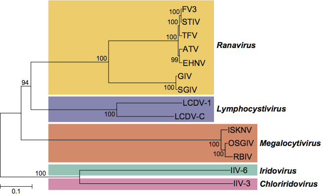 Phylogenetic analysis using the 26 core iridovirus genes from the 14 completely sequenced iridoviruses shows a clear division between the genera within the family Iridoviridae (Figure 6). Members of genera Ranavirus, Lymphocystivirus and Megalocytivirus are in three separate clades with a common ancestor, while members of the genera Iridovirus and Chloriridovirus form two clades that are more distantly related. In addition, the phylogeny shows a distinct lineage for each genus within the family Iridoviridae, with the vertebrate genera being more closely related to each other as compared to the invertebrate genera.
