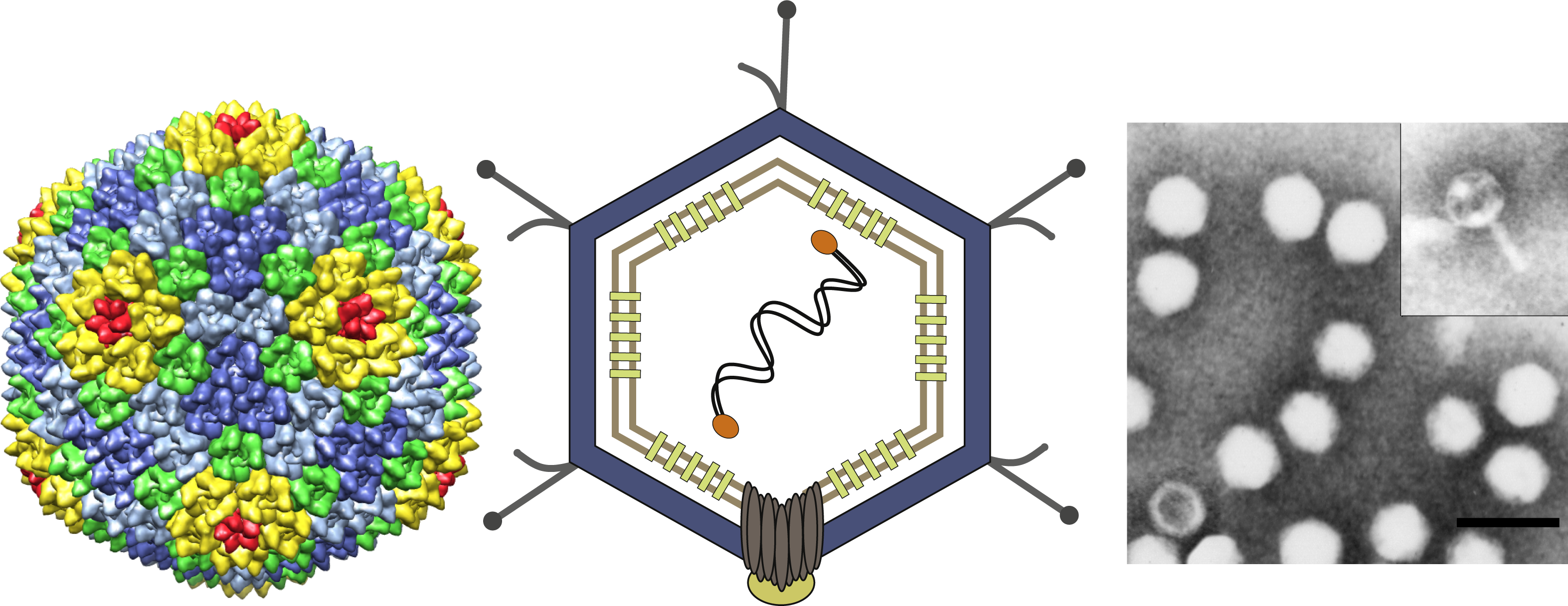 Figure 1 (Left) X-ray crystallography-based structure of the virion of Enterobacteria phage PRD1 (pseudo T=25) viewed down two-fold axis of symmetry. (Middle) Schematic picture of the virion. (Right) Negative stain electron micrograph of phage PRD1 particles. The inset shows a particle with a protruding membranous tail-like structure. The bar represents 100 nm.