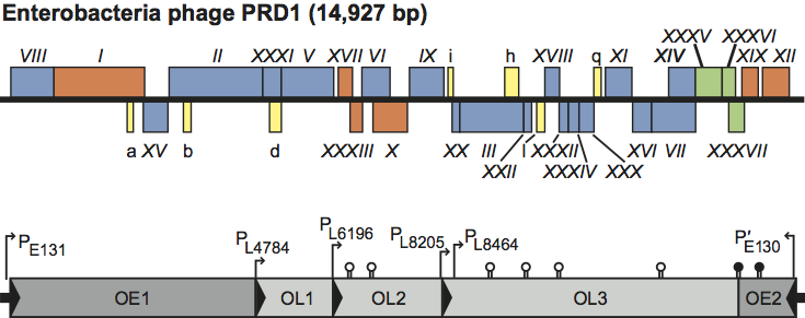Figure 2 The genome of Enterobacteria phage PRD1 (PRD1) indicating the organization of genes and promoters (P) and their reading direction. Gene and protein nomenclature are correlated so that each protein has the same number (Arabic numeral) as the gene (Roman numeral). ORFs with no confirmed protein product are indicated by lower case letters. (Top) Order of genes; genes XIX and XII are on one strand and all other genes are on the other strand. The different colors indicate the ORFs (yellow) and the genes coding structural proteins (blue), nonstructural proteins (orange) and proteins involved in lysis (green). (Bottom) Promoters (P), terminators (lollipops) and operons (O) and their reading directions; E=early, L=late.