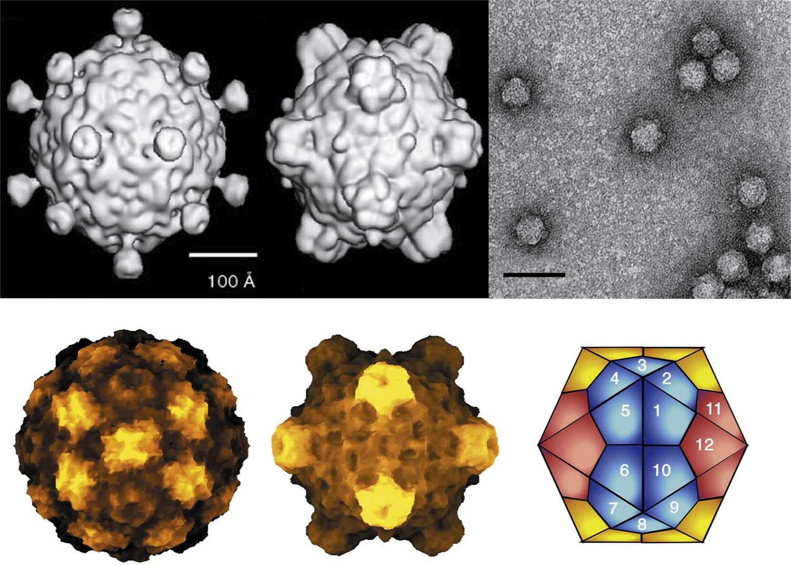 Figure 1 (Top left) Cryo-image reconstructions of the two morphologies represented within the family Microviridae: (left) Spiroplasma phage 4 (SpV4) (genus Spiromicrovirus); (right) Enterobacteria phage X174 (X174) (genus Microvirus) (courtesy T. Baker, R. McKenna and M.G. Rossmann). (Top right) Negative contrast electron micrograph of X174 particles. The bar represents 50 nm. (Bottom) Electronic rendering surface of X174 particles (left, scaffold; center, procapsid) and diagram representing the T=1 lattice.