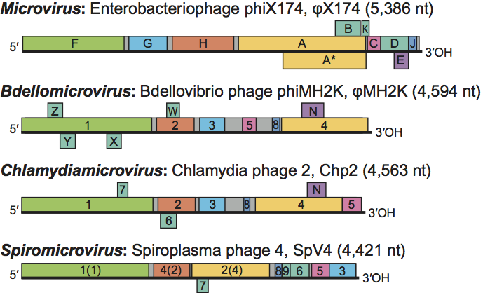For those genera in which multiple species have been sequenced (Microvirus and Chlamydiamicrovirus), genome arrangement is close to identical within the genus. The genome arrangement of the only sequenced member of bdellomicroviruses, Bdellovibrio phage φMH2K (φMH2K), is extremely similar to that found in chlamydiamicroviruses, with the exception of the location of gene 5.