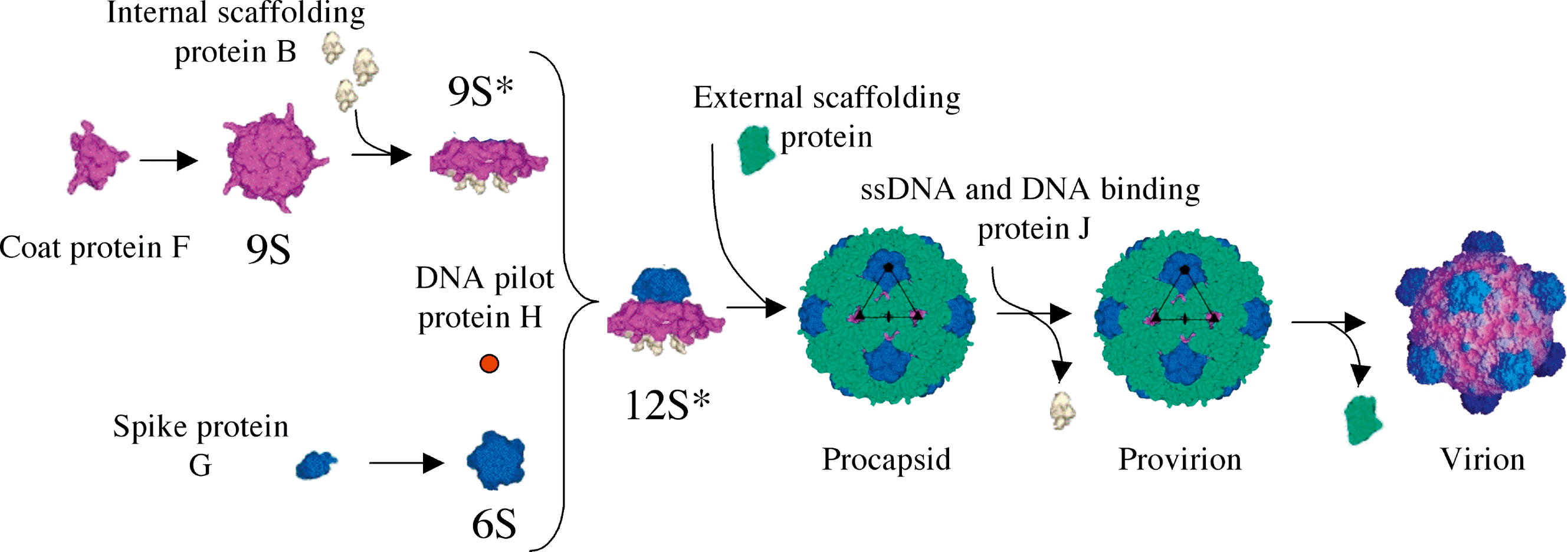 The first assembly intermediates in procapsid morphogenesis are 9S and 6S particles, pentamers of viral coat and spike proteins, respectively (Figure 3). Five internal scaffolding proteins (protein B) bind to the underside of a 9S particle, which produces the 9S* particle. The upper surface of the viral coat protein can now interact with spike and external scaffolding proteins. 9S* particles are also less prone to aggregate prematurely than 9S particles and the presence of protein B may facilitate the incorporation of the minor vertex protein, or DNA pilot protein, protein H. Twelve 12S* particles then associate with external scaffolding proteins (protein D) to form the procapsids. In the φX174 procapsid crystal structure, four D proteins, as dimers of dimers, are associated with one CP. After particle formation, two-fold related B-B and D-D scaffolding contacts keep the CP pentamers from dissociating during DNA packaging.