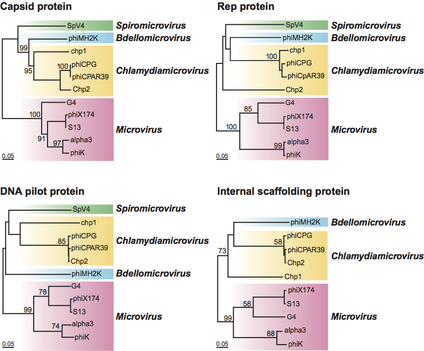 Figure 4 (opposite) Phylogeny of the family Microviridae. The aa sequences of the capsid protein (tTop left), the Rep protein (top right), the DNA pilot protein (bottom left) and the internal scaffolding protein (bottom right) were used to make alignments with the CLUSTAL X software. The trees were designed with PAUP and the bootstrap values are indicated above 50%. The abbreviations of the viruses used and their GenBank accession numbers are listed in the List of Species of the description.